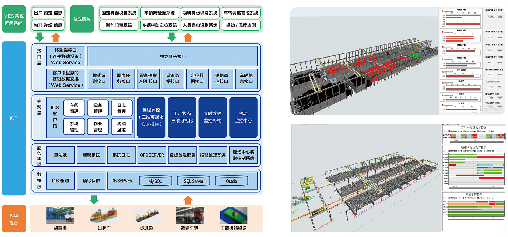 智能起重輸送是包含了庫區(qū)管理、調(diào)度算法、智能搬運等子系統(tǒng),形成了感知、決策、執(zhí)行的智能化整體解決方案。該系統(tǒng)在標準的生產(chǎn)流程、規(guī)范的操作過程的基礎(chǔ)上,通過位置傳感器、機器視覺等感知設(shè)備狀態(tài)、庫存狀態(tài)等環(huán)境信息,經(jīng)庫區(qū)智能管理系統(tǒng)分析后自主分解生產(chǎn)計劃,通過智能調(diào)度、路徑規(guī)劃等技術(shù)形成運行指令,通過自主控制、精確定位等技術(shù)由智能設(shè)備自主完成任務(wù)指令并反饋執(zhí)行結(jié)果。該系統(tǒng)還具有遠程運維、云服務(wù)及移動推送等功能,實現(xiàn)全生命周期管理和現(xiàn)場實時監(jiān)控。