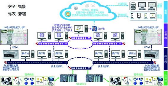優(yōu)勢:包含控制網、核心網、管理網以及云端四級工廠網絡,兼容開放性好,設置軟硬件結合的縱深防御措施,安全性好,根據實時參數(shù),按照模型進行仿真,推薦合理的運行參數(shù),結合礦熱爐工藝參數(shù)、運行參數(shù),計算出電極工作端實際位置