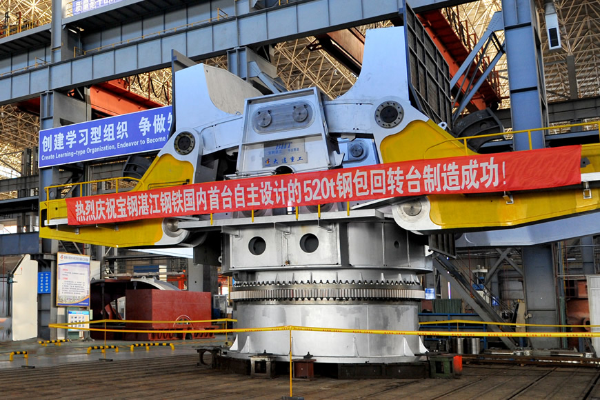 大包轉(zhuǎn)臺安裝在連鑄車間鋼水接受跨和連鑄跨之間的澆鑄平臺上,用于接受煉鋼系統(tǒng)送來的盛滿鋼水的鋼包,將鋼包轉(zhuǎn)至連鑄跨的澆注位置進行澆注。大連重工研制的大包轉(zhuǎn)臺產(chǎn)品單臂承載能力從42噸到520噸,尤其是大噸位(大于200噸)鋼包回轉(zhuǎn)臺國內(nèi)市場占有率很高,產(chǎn)品功能從單一回轉(zhuǎn)型發(fā)展到多功能型。
